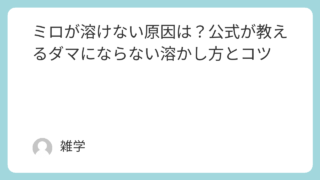 生活全般 ミロが溶けない原因は?公式が教えるダマにならない溶かし方とコツ 冷たい牛乳でミロを作ると、底にザラザラが残ってしまうことがありますよね。実はその「溶け残り」には、ちゃんとした理由があるんです。この記事では、ミロが溶けない原因をわかりやすく解説し、ネスレ公式が推奨する正しい溶かし方や、忙しい朝でも簡単にで... 生活全般