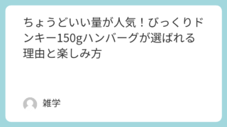 生活全般 ちょうどいい量が人気!びっくりドンキー150gハンバーグが選ばれる理由と楽しみ方 外食でハンバーグを食べたいけれど、量が多すぎると感じることはありませんか。そんなときに選ばれやすいのが、びっくりドンキーの150gハンバーグです。ほどよい量で満足感があり、女性からの支持も高いサイズとして知られています。この記事では、150... 生活全般
