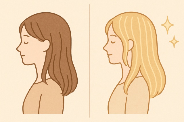 全体染めは髪全体に均一な色が入るため、ツヤ感は出やすい一方で、のっぺりとした印象になりがちです。