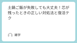 生活全般 土鍋ご飯が失敗しても大丈夫!芯が残ったときの正しい対処法と復活テク 土鍋で炊いたご飯って、ふっくらツヤツヤで特別なおいしさがありますよね。でも、いざ炊いてみると「芯が残って固い」「思ったより焦げた」など、うまくいかないことも多いものです。実は、土鍋ご飯の失敗には必ず理由があり、正しく対処すればしっかり復活で... 生活全般