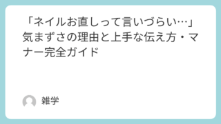 生活全般 「ネイルお直しって言いづらい…」気まずさの理由と上手な伝え方・マナー完全ガイド ネイルをしてもらったあと、「あれ、ちょっと気になるかも…」と感じたことはありませんか?でも、せっかく施術してくれたネイリストさんに「直してほしい」と言うのは、ちょっと言いにくいですよね。「失礼に思われないかな」「クレームみたいにならないかな... 生活全般
