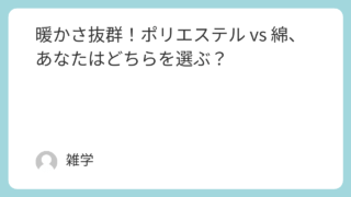 生活全般 暖かさ抜群!ポリエステル vs 綿、あなたはどちらを選ぶ? 「とにかく暖かい素材を選びたい」と場合はどんな生地が良いのでしょうか。特にインナーやパジャマ、毛布など、肌に触れるものは素材選びがとても大切です。今回は、よく使われるポリエステルと綿(コットン)について、暖かさや着心地の違いをやさしく解説し... 生活全般