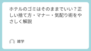 生活全般 ホテルのゴミはそのままでいい?正しい捨て方・マナー・気配り術をやさしく解説 ホテルに滞在していると、飲み物やお菓子の包装、ティッシュなど、意外とゴミが出ます。でも「ホテルではゴミをどうするのが正解なんだろう?」と迷う方は多いものです。基本的には、そのまま置いてOKです。ただし、ちょっとした置き方や気配りで、清掃スタ... 生活全般