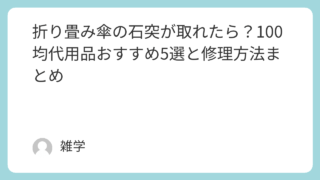 生活全般 折り畳み傘の石突が取れたら?100均代用品おすすめ5選と修理方法まとめ お気に入りの折り畳み傘、まだまだ使いたいのに先端の「石突(いしづき)」が取れてしまった……そんな経験はありませんか?傘自体は壊れていないのに、先端パーツがないだけで使いにくくなったり、見た目が気になってしまったり。でも実はこの石突、わざわざ... 生活全般