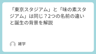雑学 「東京スタジアム」と「味の素スタジアム」は同じ?2つの名前の違いと誕生の背景を解説 「味の素スタジアム」と「東京スタジアム」。この2つの名前、実は同じ場所を指していることをご存じですか?正式名称は「東京スタジアム」ですが、現在ではネーミングライツ(命名権)によって「味の素スタジアム」という呼び名が定着しています。この記事で... 雑学
